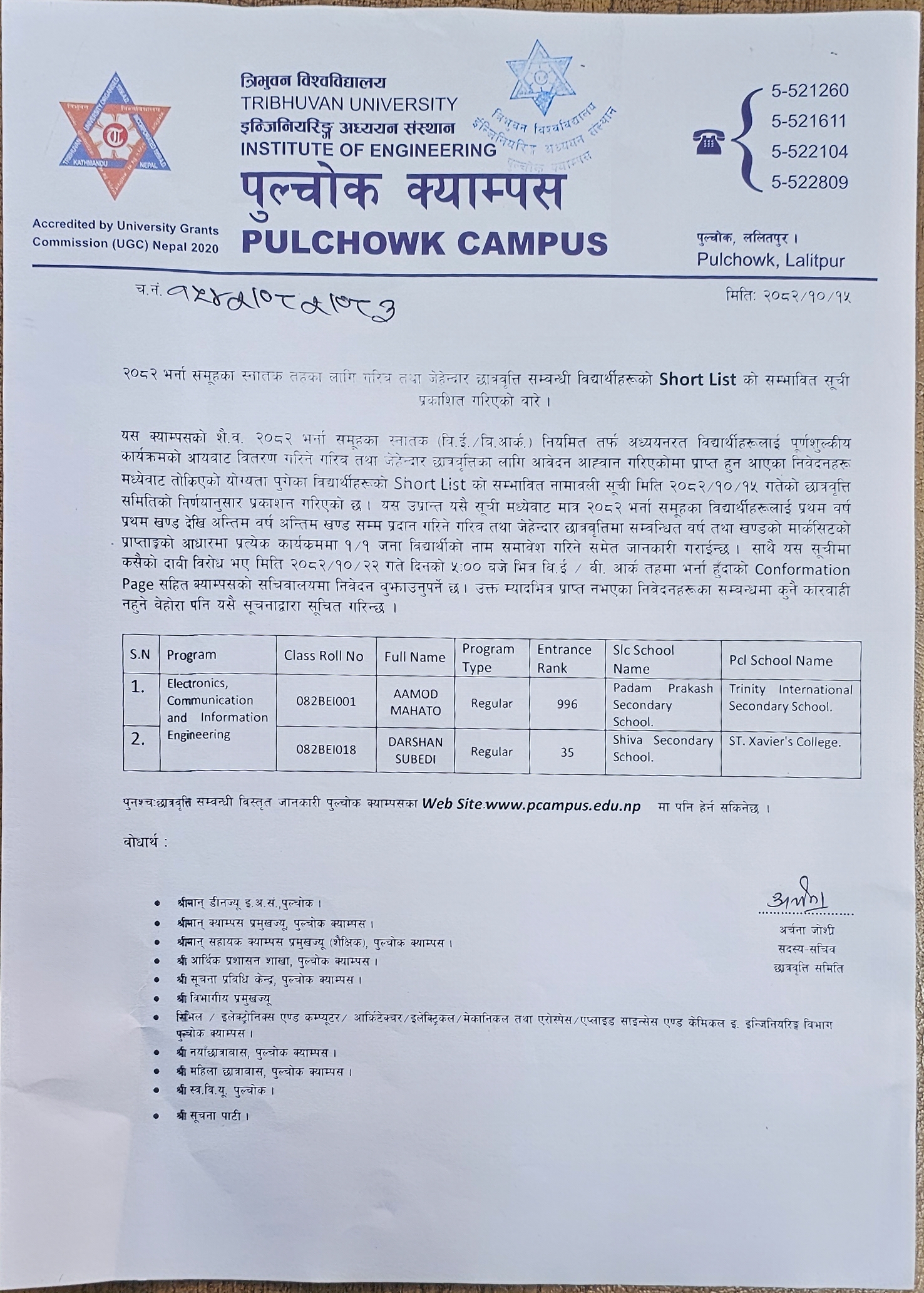 जेहेन्दार छात्रवृत्ति सम्बन्धी विद्यार्थीको Short List को सम्भावित सूची प्रकाशित गरिएको बारे February 1, 2026February 1, 2026 admin General Notices, Scholarship २०८२ भर्ना समूहका स्नातक तहका लागी तथा जेहेन्दार छात्रवृत्ति सम्बन्धी विद्यार्थीको Short List को सम्भावित सूची प्रकाशित गरिएको बारे ।